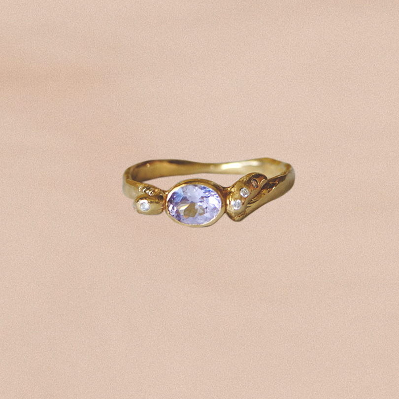 Hand-carved ring cast in solid 18kt gold, featuring a bezel-set lavender spinel accented with six white diamonds.