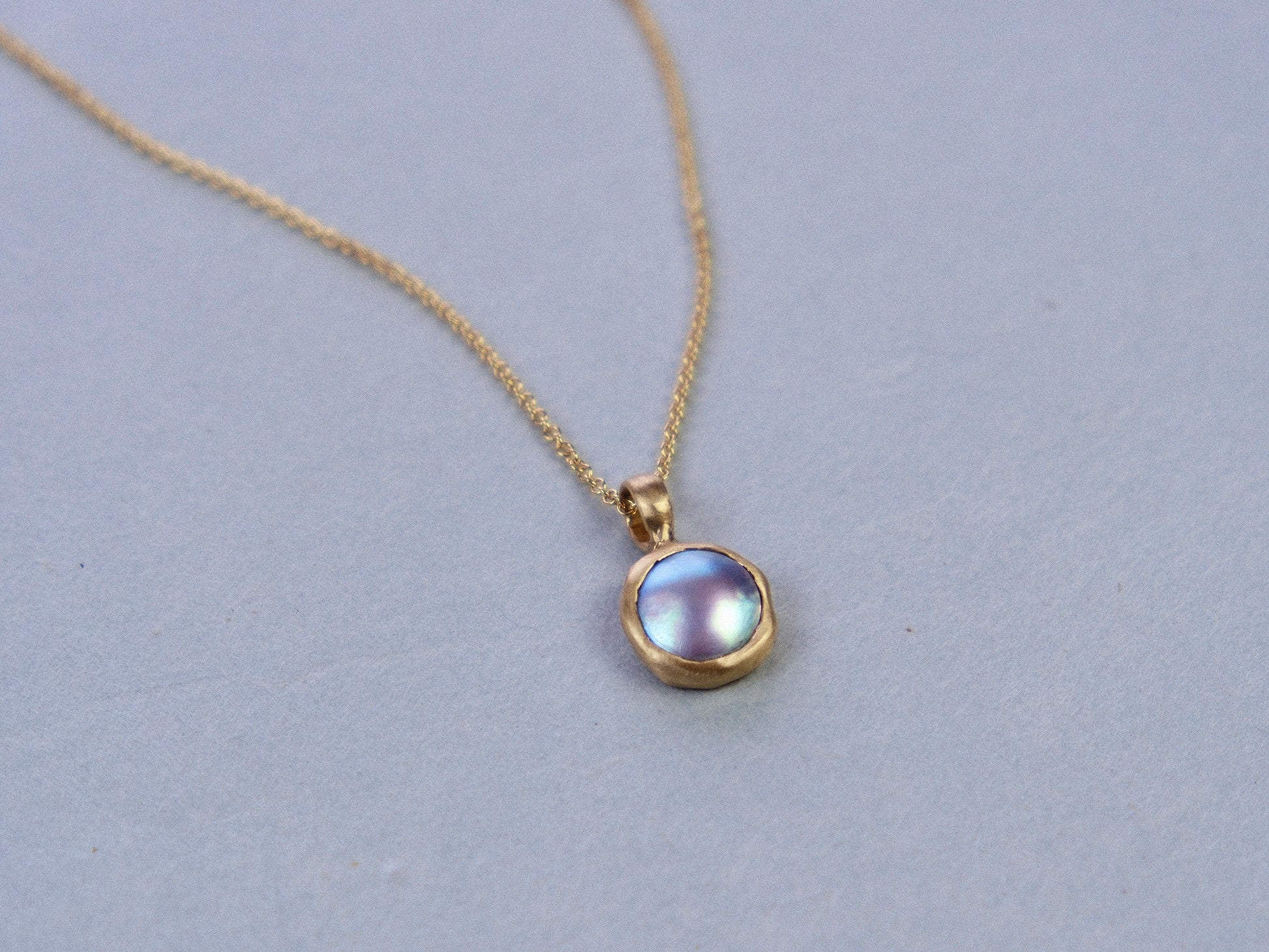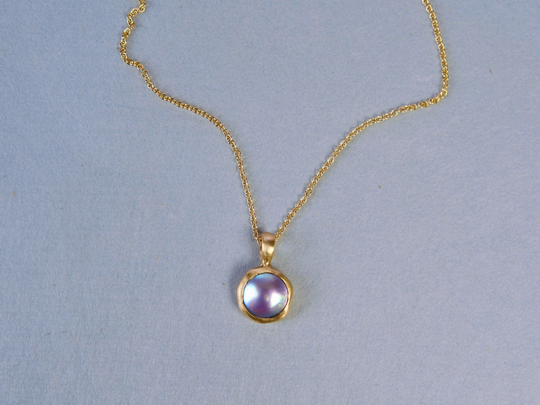 A one-of-a-kind mabe pearl wrapped in an undulating form of solid 18kt gold. An ode to the ocean to wear around your neck; a nod to the cyclical rhythm of the tides. The blue-grey pearl comes from the 'rainbow-lipped oyster' (Pteria sterna), native to Mexico's Sea of Cortez. Pendant hangs from an 18" long 18kt gold chain.