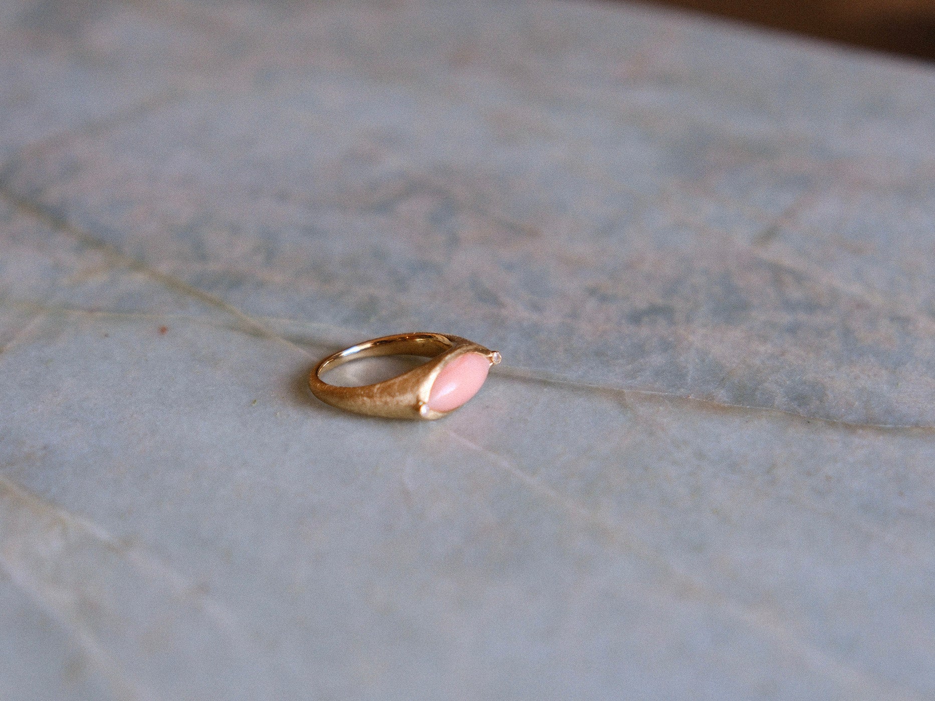 Hand-carved ring cast in solid 18kt gold, featuring a vintage 'angel skin' pink coral accented with two white diamonds.