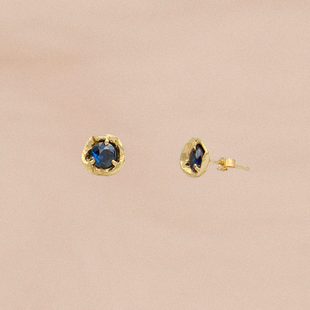 Deep-blue sapphires prong-set in textured gold. Elegant and edgy.