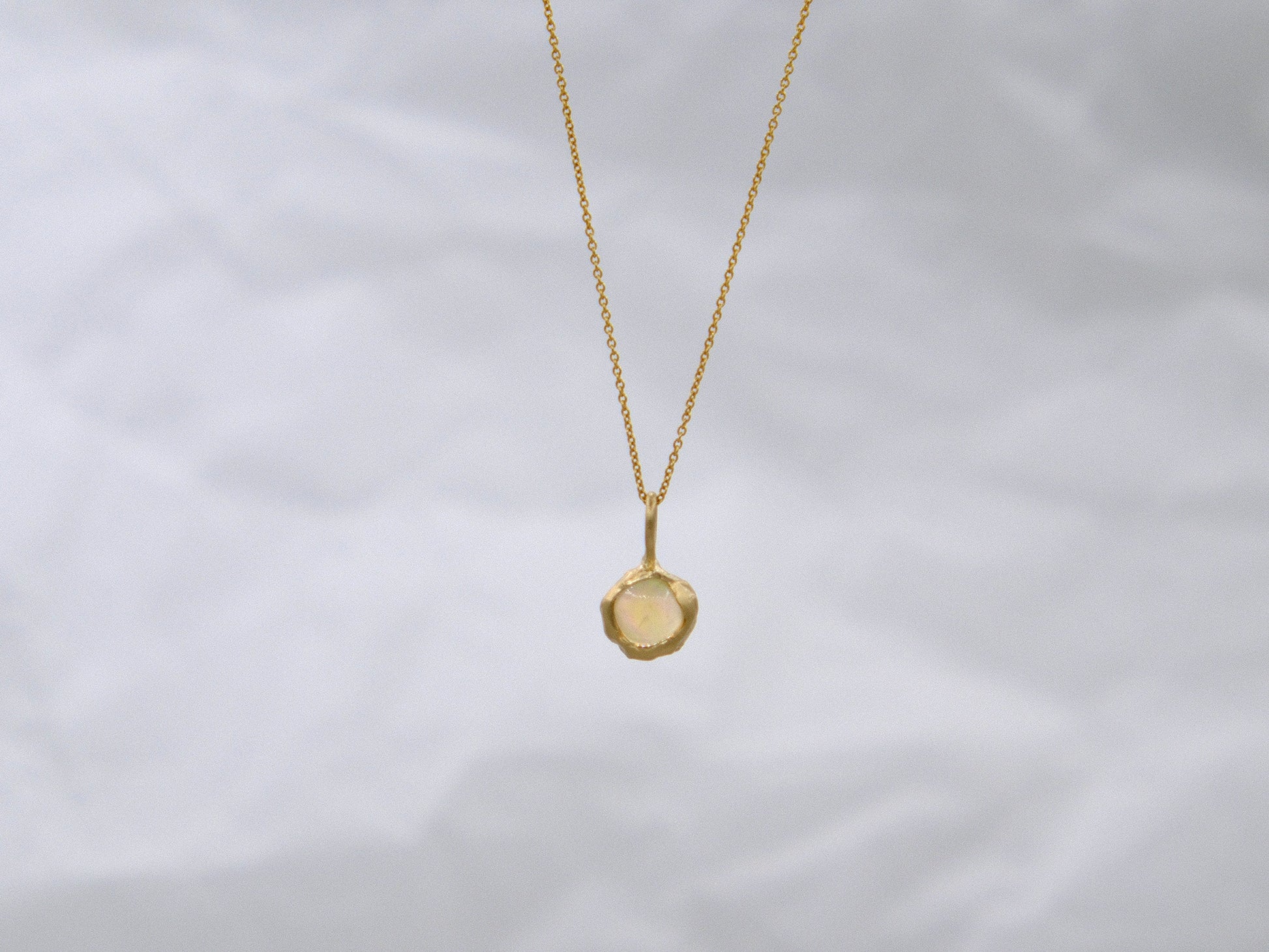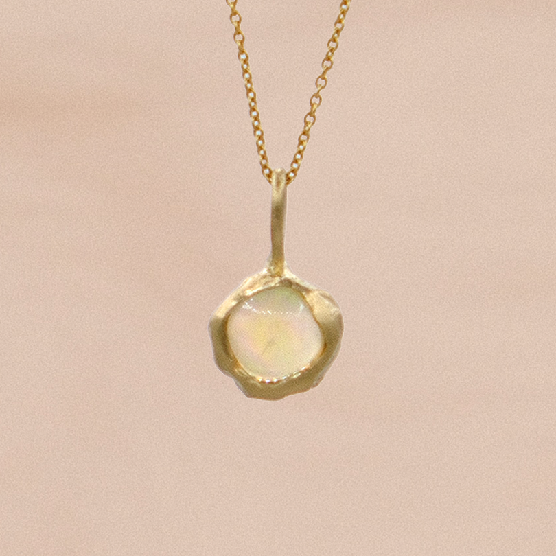 Hand-carved Terra pendant featuring an iridescent white opal embedded in solid 14kt yellow gold. The pendant features an organic texture - uneven, elemental, and tactile - evoking the raw beauty of the earth.